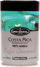 Компания Universal Caffè, а также Профессиональная Ассоциация Производителей Кофе Коста-Рики гарантируют высокое качество и подтверждают происхождение кофе с холмов Коста-Рики. Кофе Costa Rica обладает уникальным букетом цветочного аромата, который гармонирует со вкусом жареного миндаля и оттенками пряного шоколада.